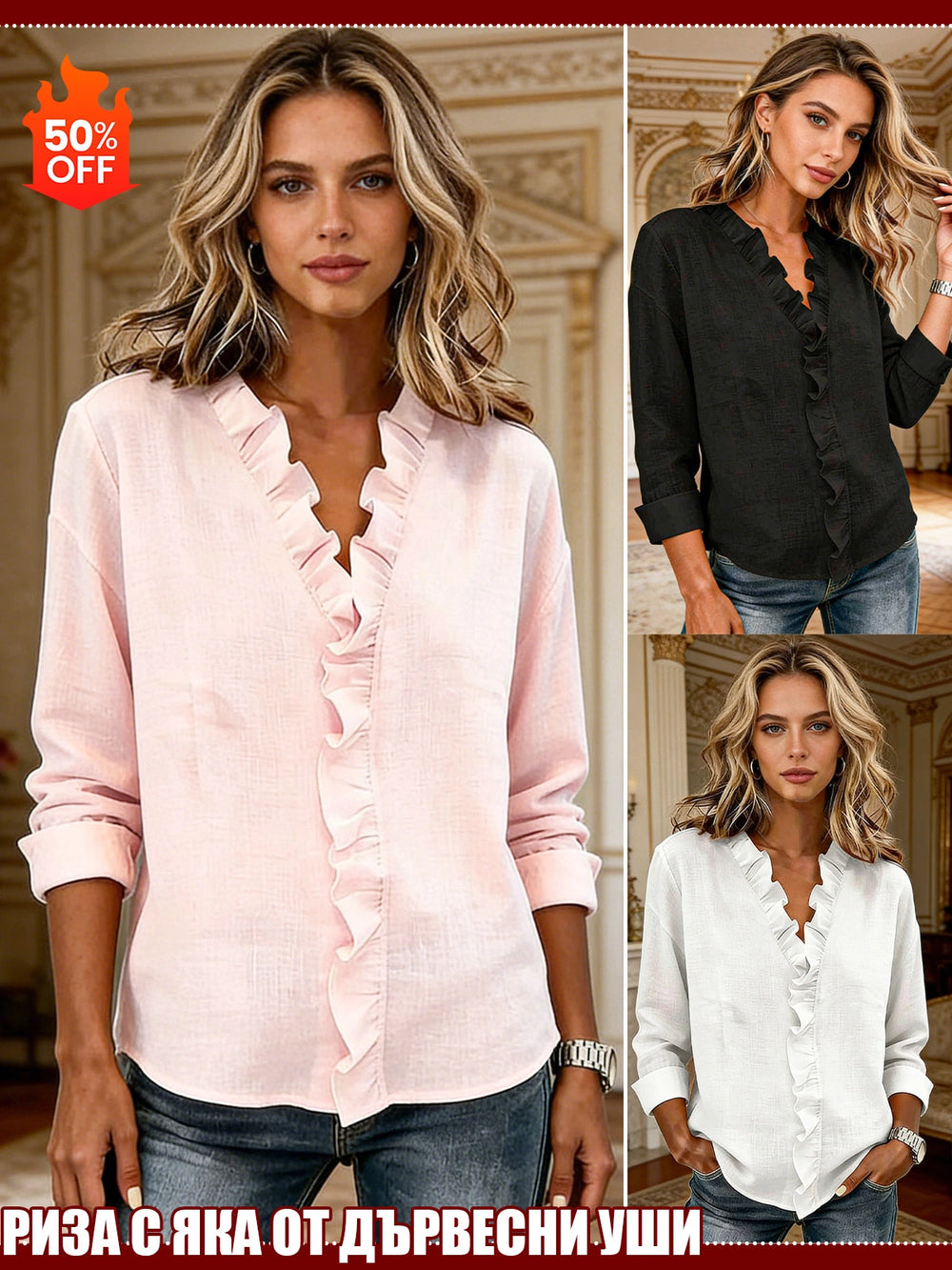 Памучна Блуза с Волани и Дълъг Ръкав