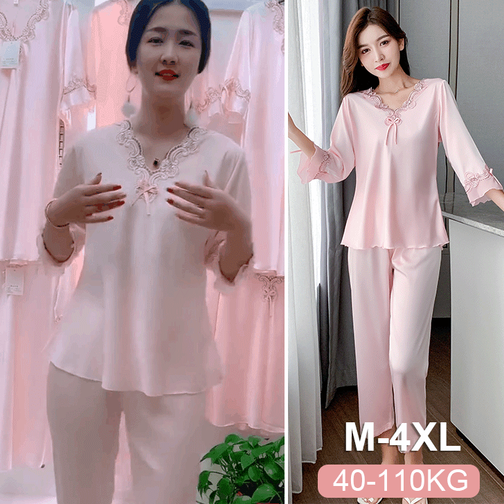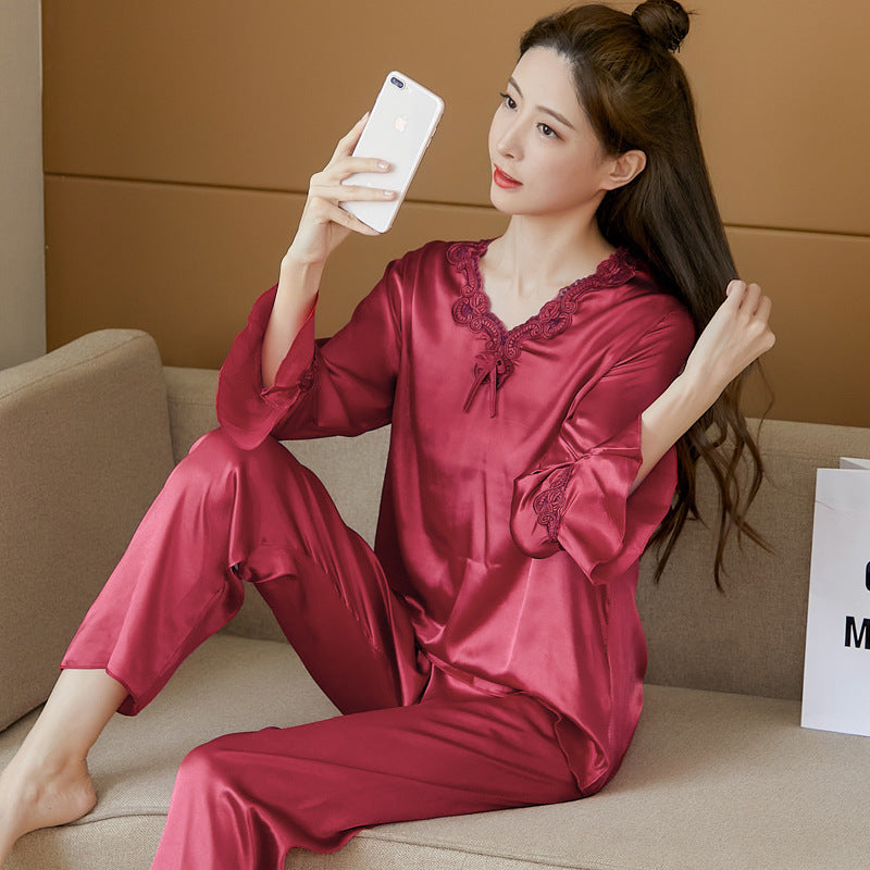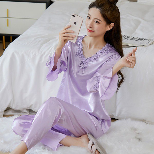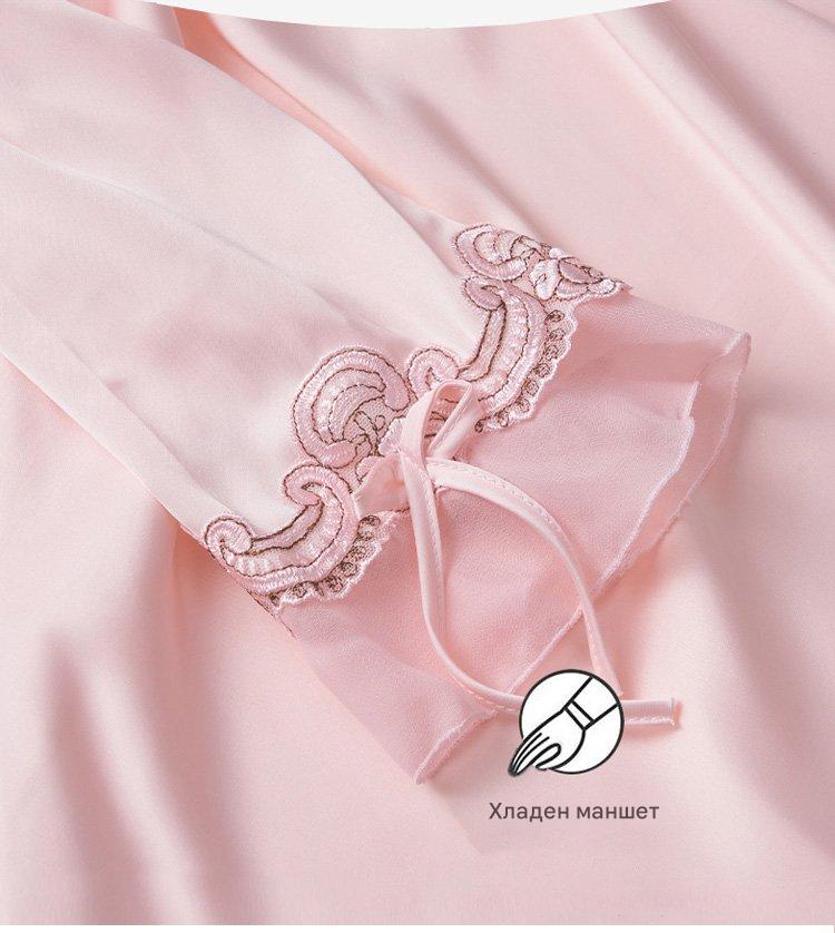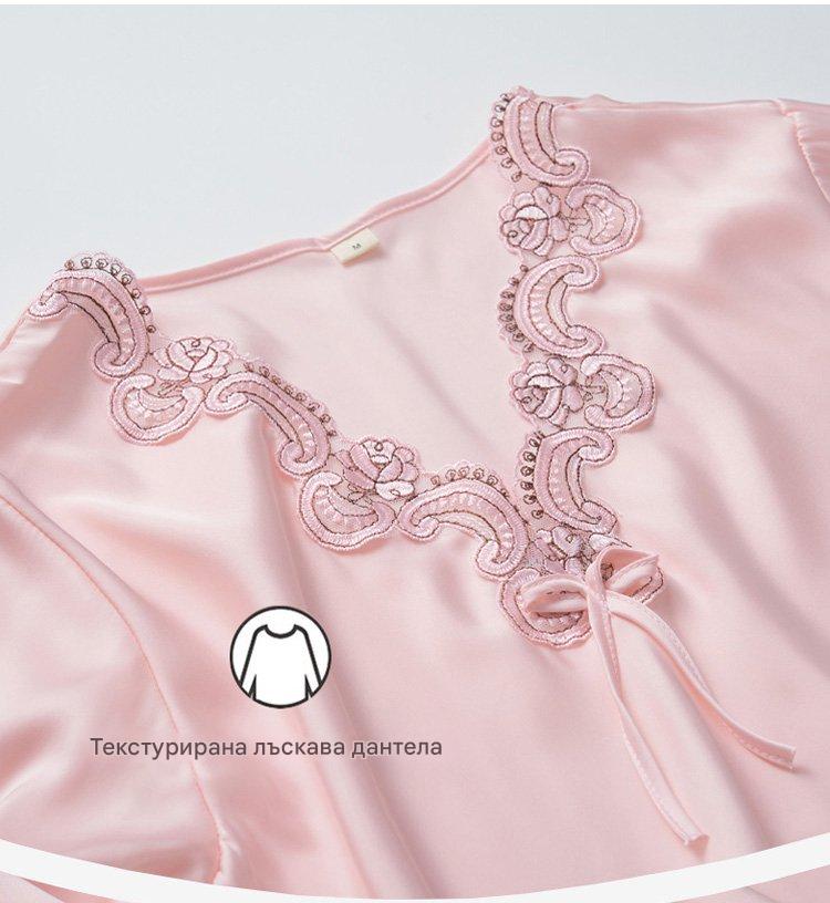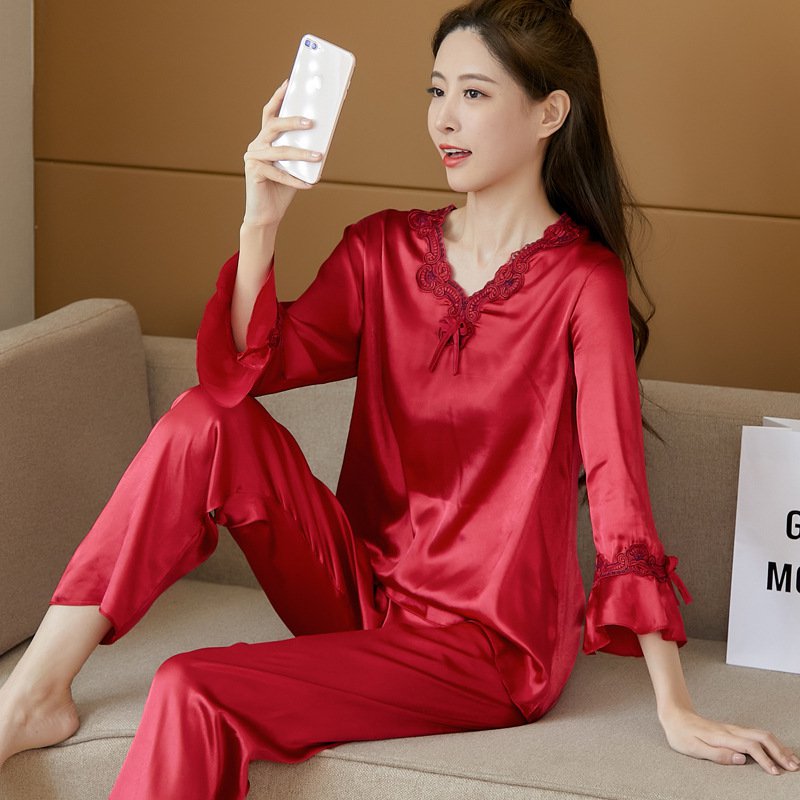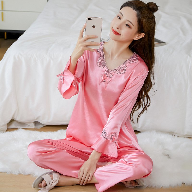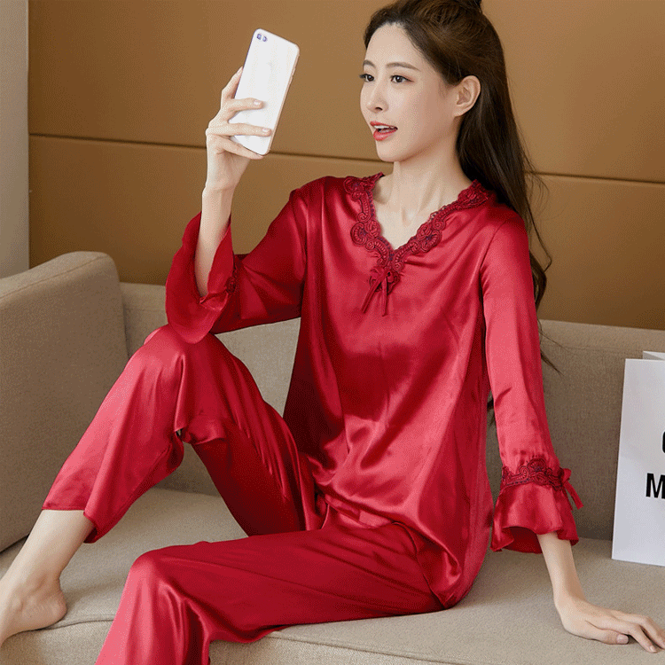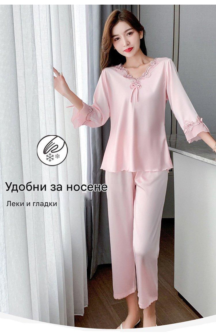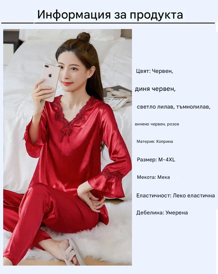 🔥【Топ с дълъг ръкав + панталон】Комплект от копринена пижама от две части за жени, домашно облекло