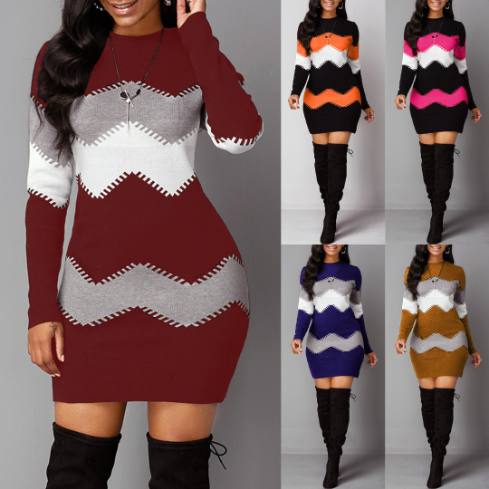 ✨【S-5XL】Плетена рокля с дълъг ръкав и кръгло деколте на райета